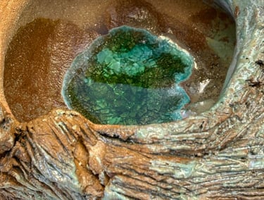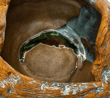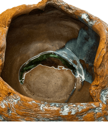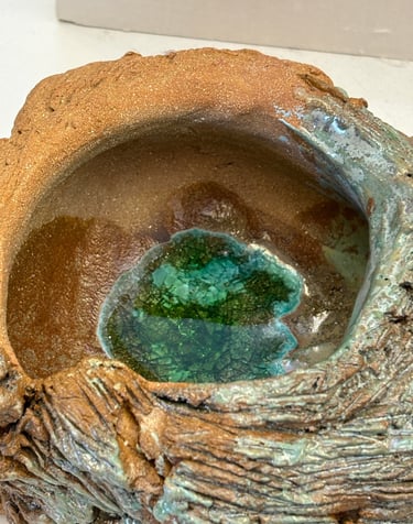 Pièce façonnée au colombin texturé, engobe vert d'eau émaillé-