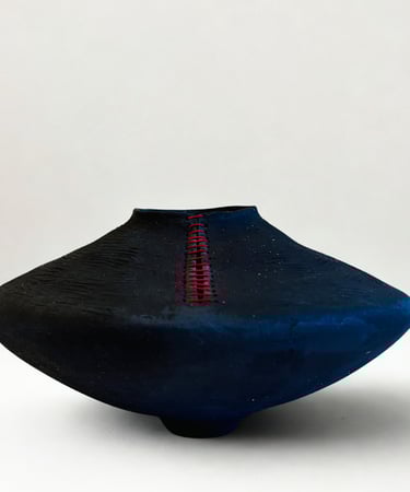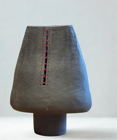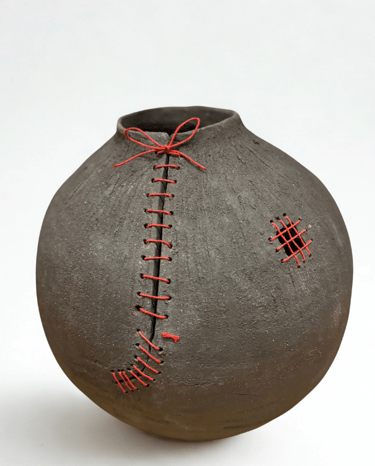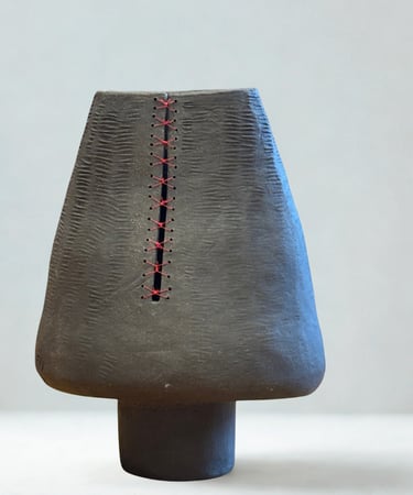 Pièce en terre noire façonnée à la plaque et au colombin, texturée et tissée d'un fil de coton rouge