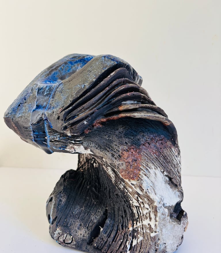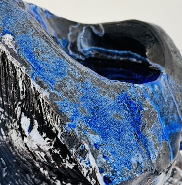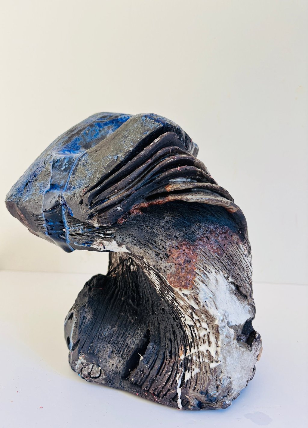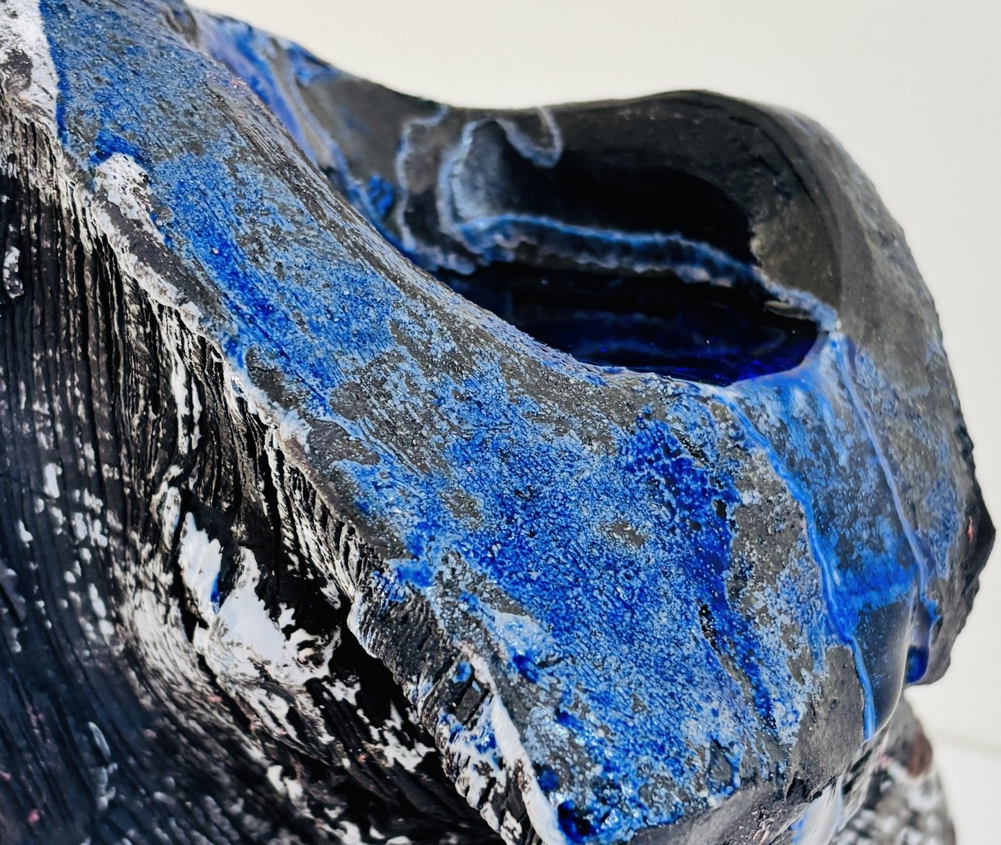 Pièce façonnée dans la masse-texturée - recouverte de kaolin, d'émail et de verre bleu